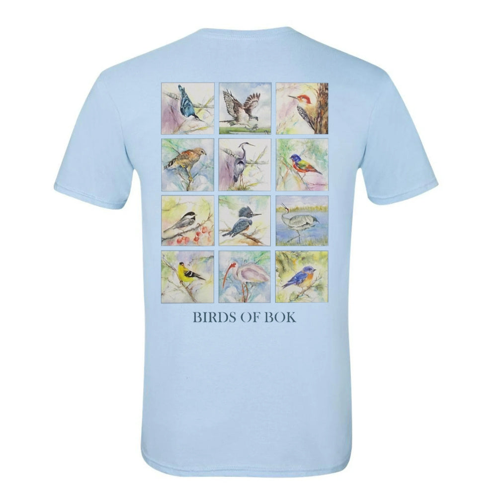 This 100% cotton light blue tee shirt will dazzle onlookers with its colorful reproductions of watercolor artwork by award winning artist Shirley Bell. The shirt's front has the Bok Tower Gardens' name in the upper left-hand corner while the back showcases the following birds that are frequently found in the gardens: