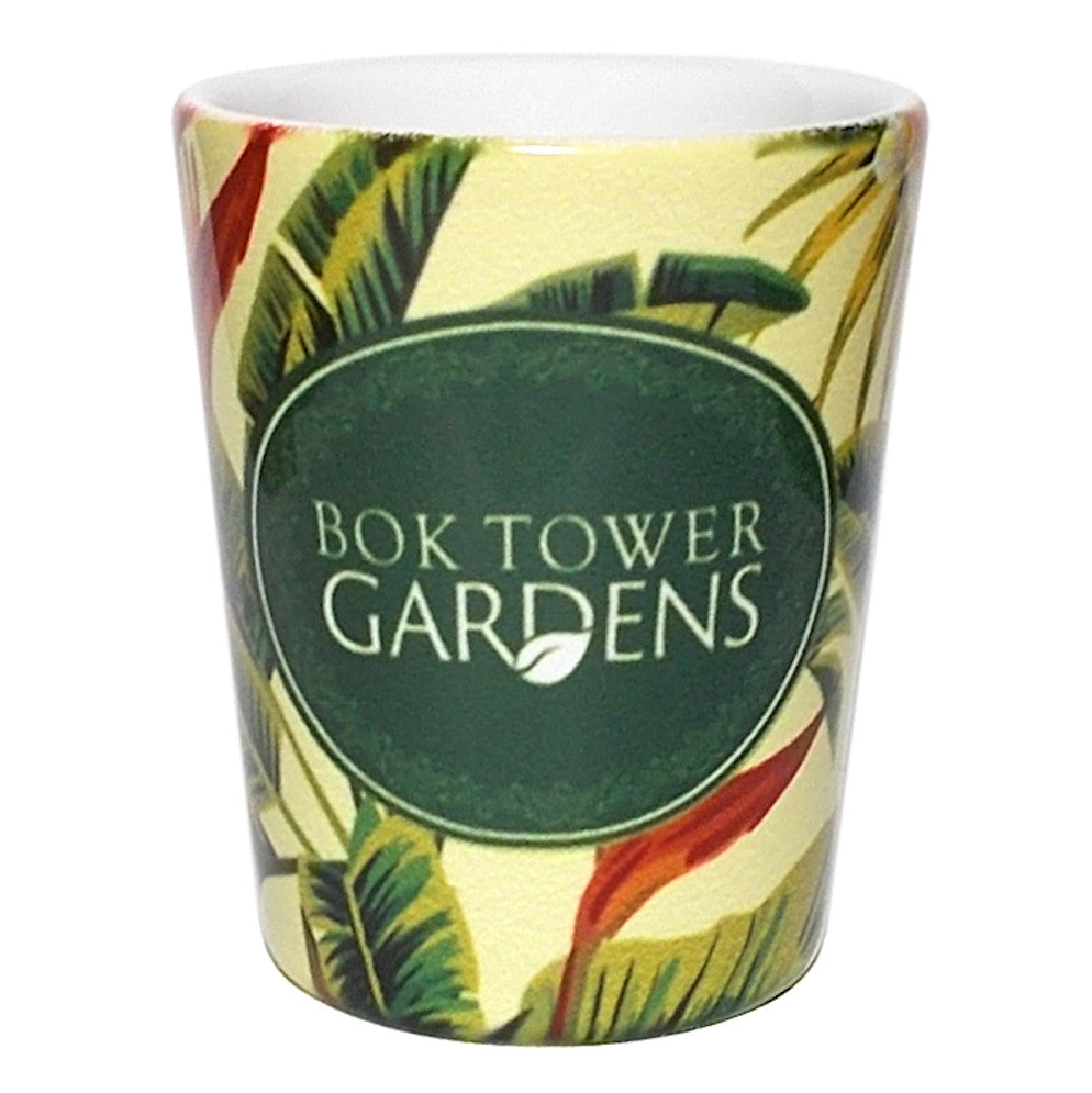 This 2-oz ceramic shot glass is beautifully designed to capture the elegance and grace of Bok Tower Gardens. Both sides feature the Bok Tower Gardens' name in a decorative green oval surrounded by vibrant heliconia plants. It will make a great addition to any shot glass collection. Microwave, dishwasher, and sanitizer-safe.