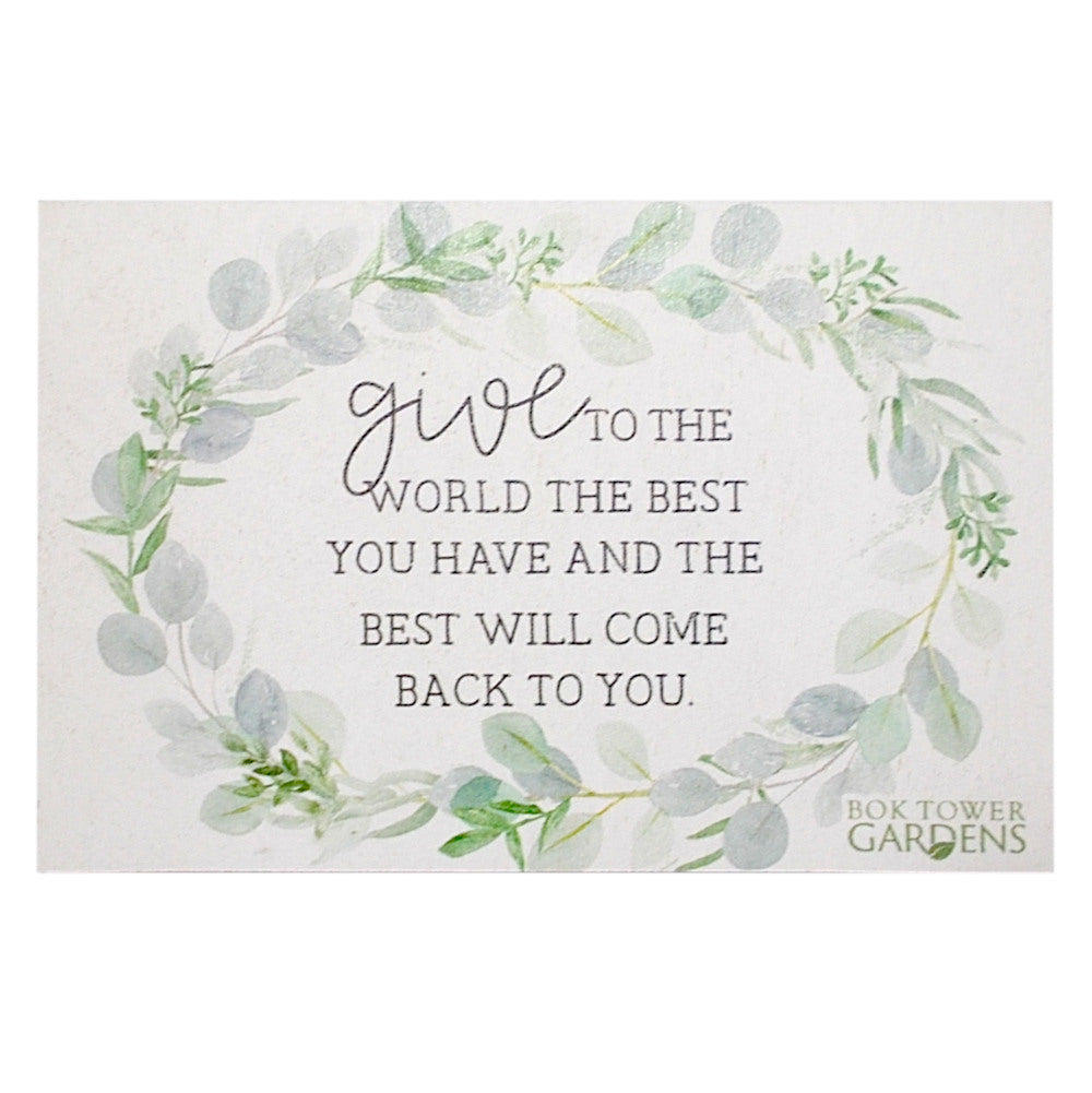 This 4" X 6" postcard is made in the USA from sustainable birch with a beautiful wood grain finish. It features the inspirational quote "Give to the world the best you have and the best will come back to you." by American poet Madeline Bridges. It can be either mailed, or you can keep it as a decorative keepsake.