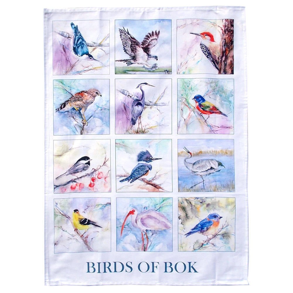This 100% cotton tea towel will brighten any kitchen décor with stunning reproductions of watercolor artwork by award-winning artist Shirley Bell. There are 12 panels that showcase in vivid colors the following birds that are frequently found at Bok Tower Gardens:
